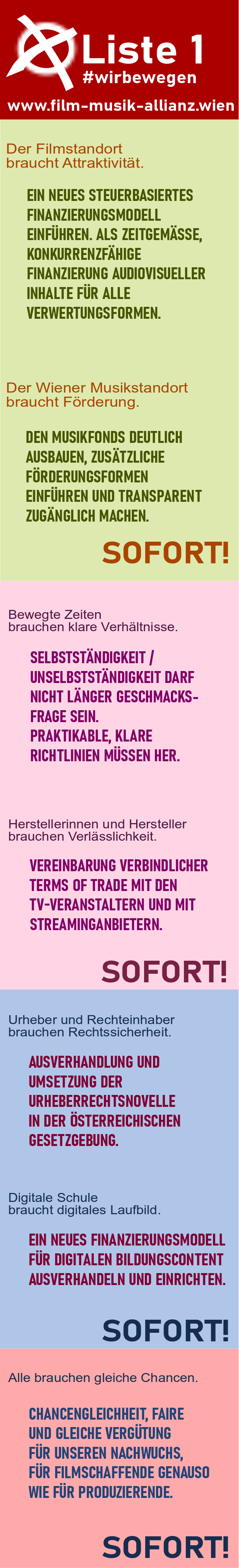 Impressum: Liste 1 „film-musik-allianz.wien“ der Wiener Film und Musikwirtschaft.